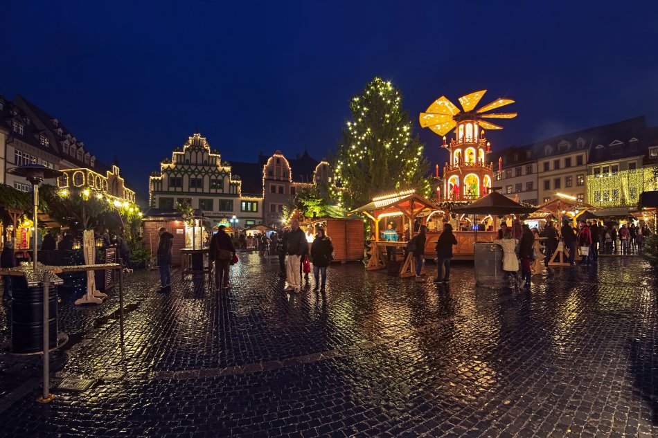 Im Thüringer Wald mit den Städten Gotha und Erfurt erwarten Sie historische Weihnachtsmärkte vor beeindruckender Kulisse und regionale Spezialitäten wie Thüringer Bratwurst oder festliches Gebäck.