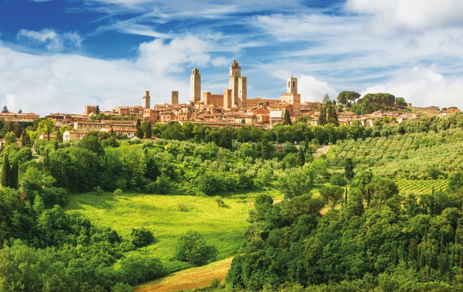 Nach dem Frühstück fahren Sie nach Volterra, eine gut erhaltene mittelalterliche Stadt mit imposanter Stadtmauer und Toren. Hier dreht sich alles umdie Verarbeitung von Alabaster, das in zahlreichen Werkstätten in den malerischen Gassen kunstvoll hergestellt und verkauft wird. Weiter geht es zueiner Pecorino-Käserei, wo Sie ein Mittagessen mit regionalen Spezialitäten erwartet. Am Nachmittag besuchen Sie San Gimignano, bekannt für seine mittelalterlichen Geschlechtertürme. Von den ursprünglichen 72 sind noch 17 erhalten, die das Stadtbild prägen und ihm einen einzigartigen Charme verleihen.