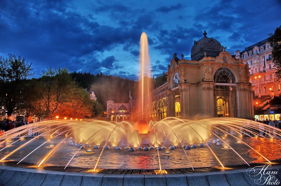 Singende Fontäne: Direkt vor der Hauptkolonnade Marienbads kann man das herrliche Wasserspiel der Singenden Fontäne im Takt zu klassischer Musik von Chopin, Mozart, Bach, Gounaod, Smetana oder Dvořák beobachten. Aus mehr als 250 Düsen tanzen die Wasserfontänen in einem fl achen, 18 Meter breiten Rundbecken um eine Blütenskulptur in der Mitte. Am Abend wird die Singende Fontäne von Lichteff ekten begleitet und zeigt ihren Betrachtern ein sinnliches Farbenspiel. Die Fontäne ist von Mai bis Oktober täglich in Betrieb.